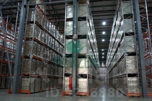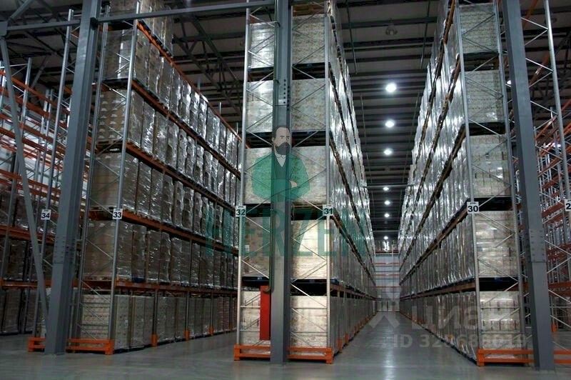 На складе установлены фронтальные стеллажи. До 35000 паллетомест. Высота несущей стойки 10,4 м.