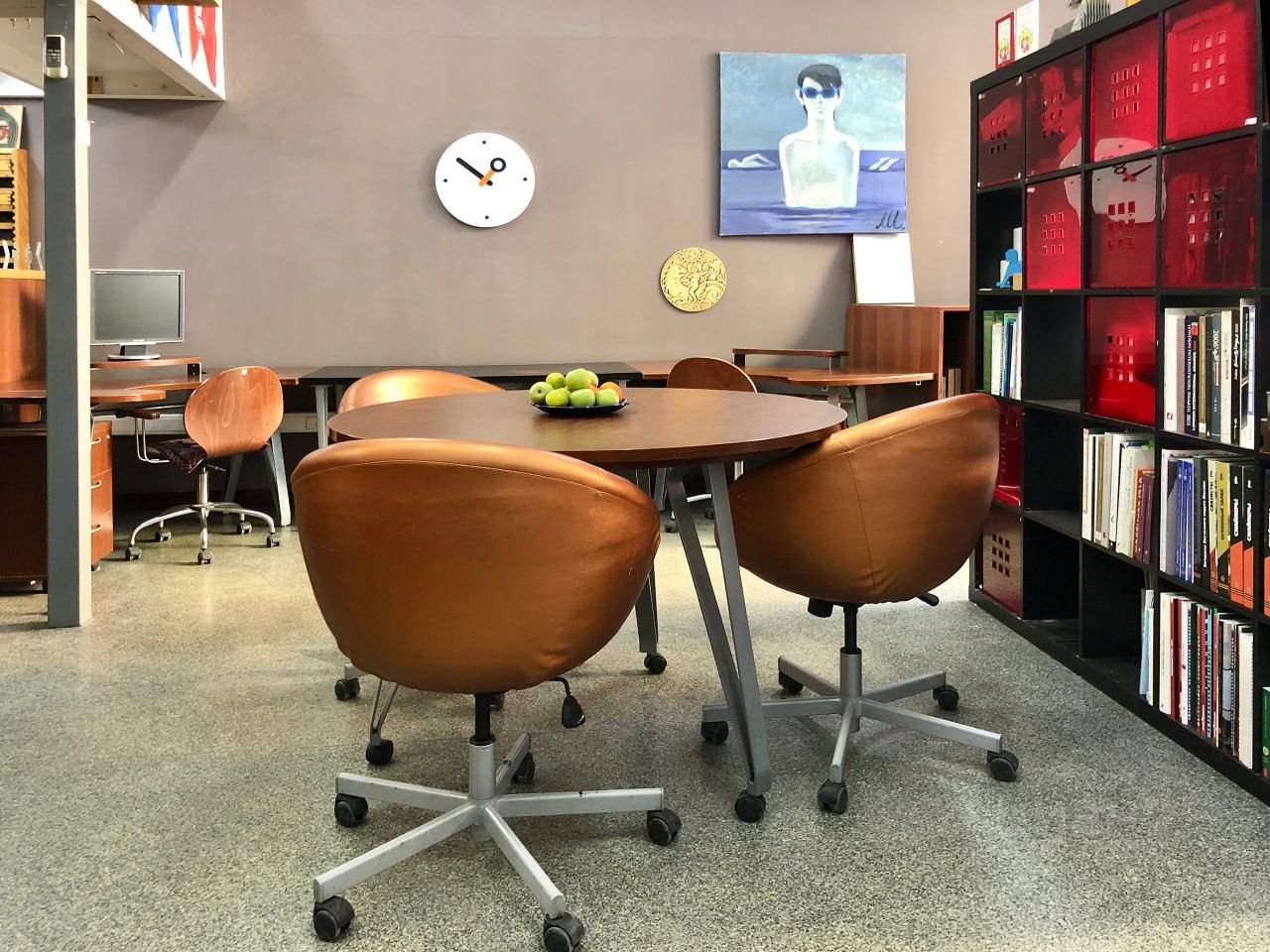 Офис обставлен офисной и антикварной мебелью, оборудованы рабочие места, есть кофемашина, холодильник и микроволновка. Можно комфортно разместить 6-8 человек. Быстрый интернет — разумеется, на месте.