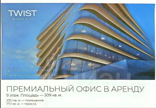 Офис в аренду. Престижный бизнес-центр класса А. Престижное место в деловом центре. Удобство и транспортная доступность. Собственная, панорамная терраса. Видовой офис 231,1 кв.м. с панорамным остеклением и собственной террасой 77,1 кв.м. на крыше. Правильная форма помещения позволяют максимально эффективно зонировать пространство. Наличие мокрой точки дает возможность обустроить в офисе кухню, или доп. санузлы, а собственную террасу можно использовать в качестве воркаут-зоны, или пространства для работы и отдыха на открытом воздухе.