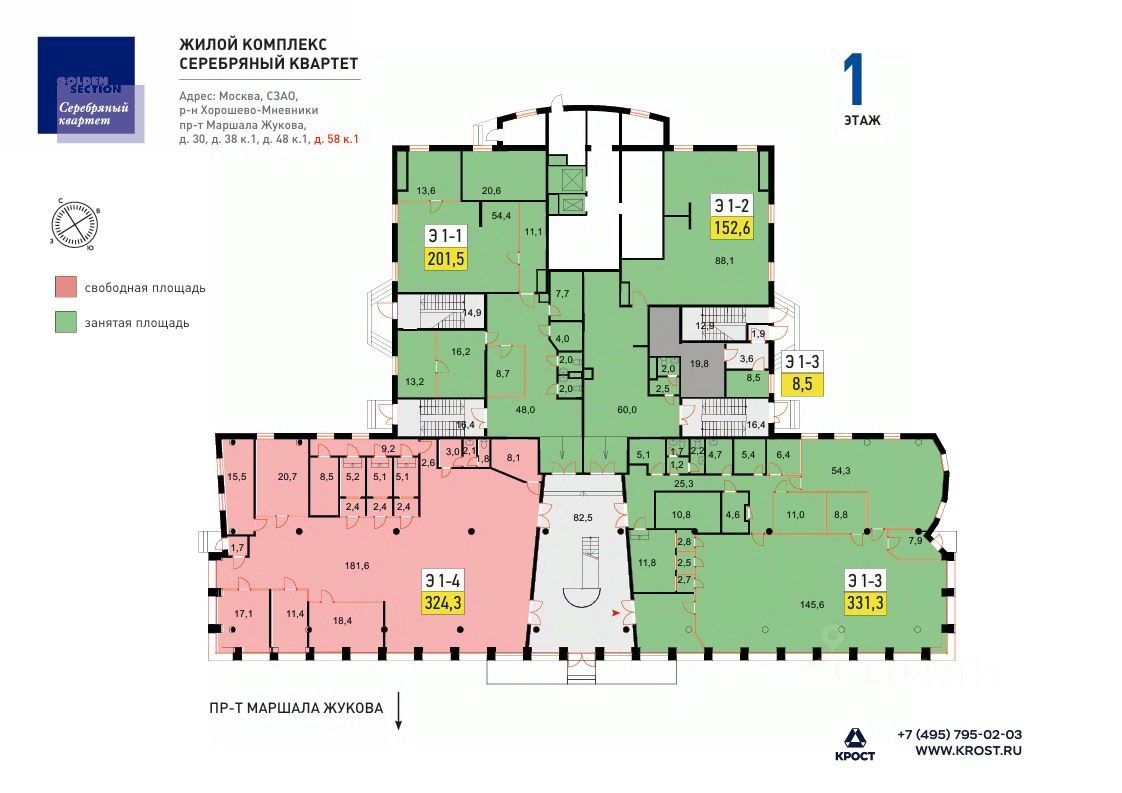 Архитектурный ансамбль "Серебряный квартет", состоящий из четырех стилобатов, расположен на первой линии крупнейшей столичной магистрали - проспекта Маршала Жукова, вдоль интенсивного пешеходного и автомобильного потока, в окружении густонаселенного жилого массива. Квартал расположен рядом с тремя станциями метро: "Народное Ополчение", "Полежаевская", "Октябрьское поле".