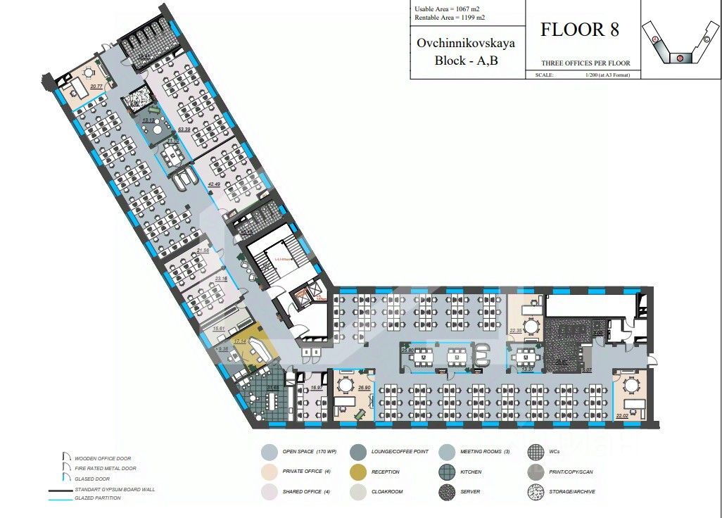 1108817. Предлагаем в аренду сервисный офис площадью 1 199 кв. м, 171 рабочее место, расположенный в бизнес-центре на Овчинниковской набережной