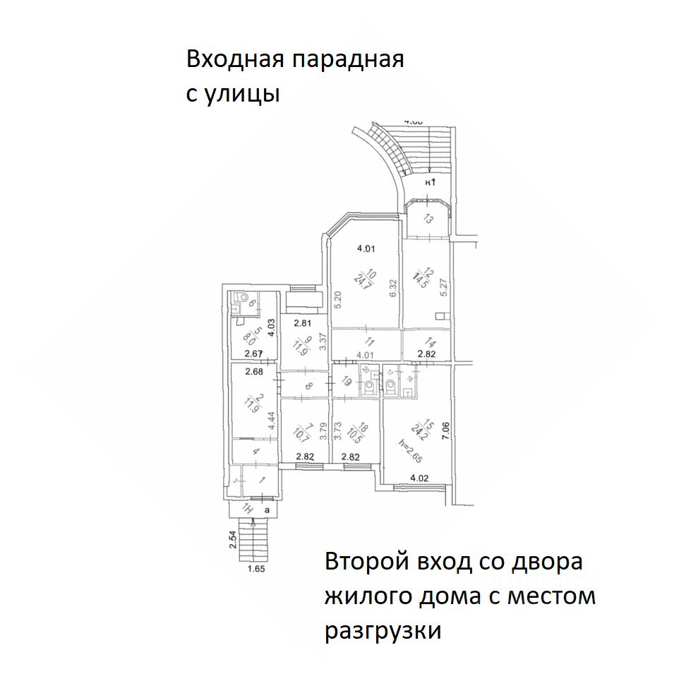 Два входа, один парадный с пешеходной зоны, второй погрузочный со стороны подъездов.