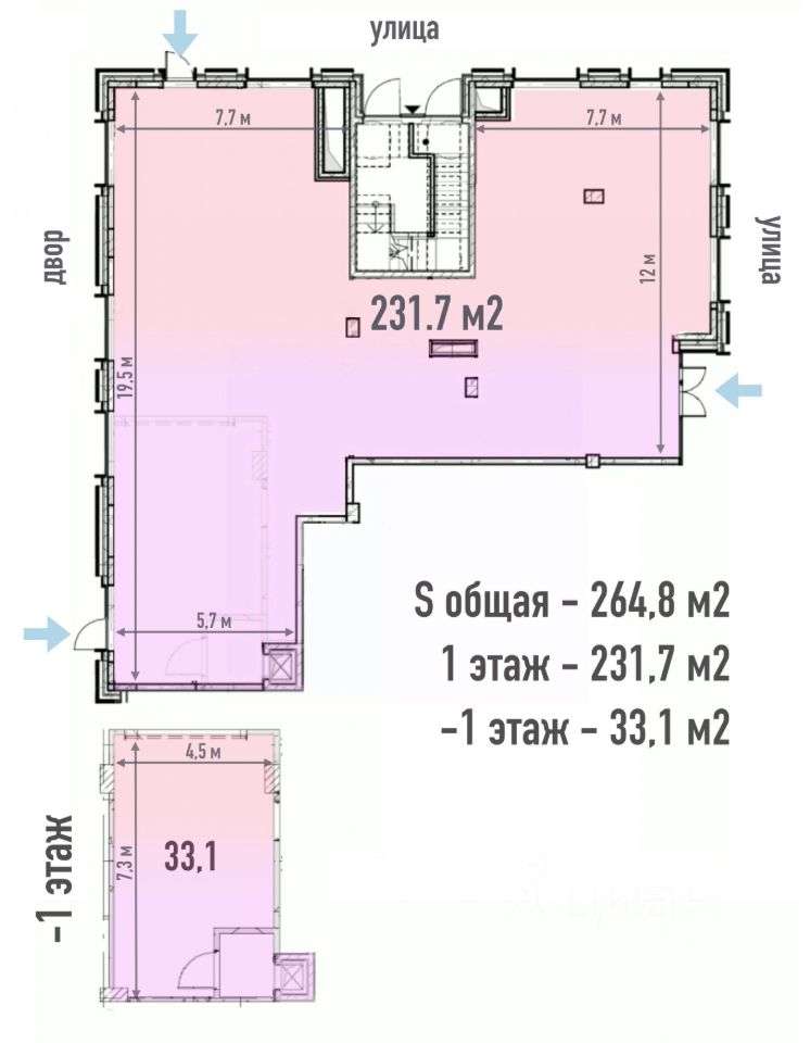 - 231,7 м² на уровне 1 этажа с двумя входами (основной — на пешеходный бульвар, дополнительный — со двора).