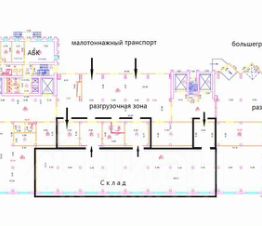 * 1 этаж (складской), Часть 1-го этажа (несколько смежных помещений и общий Складской зал) имеет высоту 5,4 м. Из склада два выхода на общую разгрузочную зону (крытый пандус) для малотоннажного транспорта и на пандус для большегрузного транспорта . Помещение без стеллажей. Нагрузка на пол 2,0т на кв м.