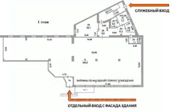 Описание помещения: Помещение с отдельным входом с фасада здания, а также служебным входом, оснащённое огромной стеклянной витриной и возможностью размещения вывески. Электрическая мощность составляет 99,4 кВт, предусмотрен круглосуточный доступ.