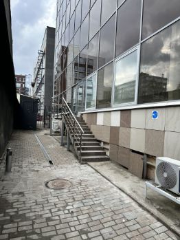 Вход в наш офис отдельный с улицы, с уличной лестницы. У нас первый этаж, но высокий, порядка полутора метров надо подняться по уличным ступеням.