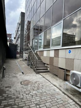 Чтобы попасть в помещение надо пройти по пешеходной дорожке вглубь двора, и подняться на полтора метра по уличной лестнице. Вход с улицы только в одно это помещение. С главной улицы вход и вывеску не будет видно.