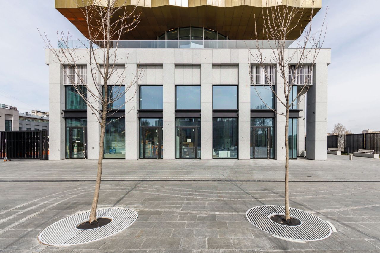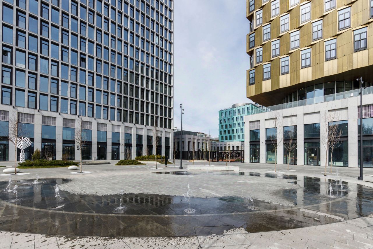 Закрытая территория жилого комплекса, продуманное благоустройство, эксплуатируемые кровли стилобата, образовательный центр с детским садом создают приватное пространство для тихой семейной жизни, а городская площадь с фонтанами, ресторан, супермаркет, коммерческая инфраструктура на первых этажах привносят созвучную с ритмом города динамику.