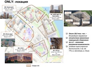 В шаговой доступности сданы и давно заселены ЖК "Фили Град" и одноименный бизнес-центр, ЖК "Береговой" и "Мой адрес на Береговом". Сам ЖК ONLY сдан еще в 2017 году и заселен на 100%. Также вокруг построены и заселены реновационные дома, а также готовится к вводу бизнес-центр "Эйлер", что также обеспечит приток клиентов в данную локацию.