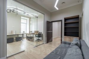 Офис находится на высоком первом этаже жилого дома. Два входа в офис: отдельный со двора и общий через подъезд дома. Въезд по двор под шлагбаум, наземная паковка. Офис кабинетной планировки: 5 кабинетов, сан. узел, кухня, зона ожидания для приема клиентов. Удобная транспортная доступность, круглосуточный доступ.