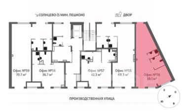 1095074. Предлагаем помещение свободного назначения, площадью 59,1 кв. м, расположенное на первом этаже жилого дома в ЖК "Лучи". Корпус 15.