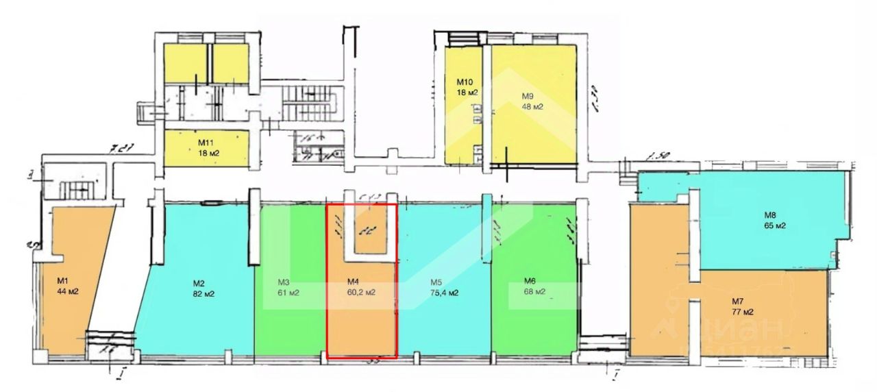 1168637. Предлагаем помещение свободного назначения, площадью 60,2 кв. м., расположенное на первом этаже встроенно-пристроенной части 9-этажного жилого дома.