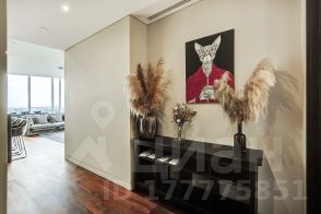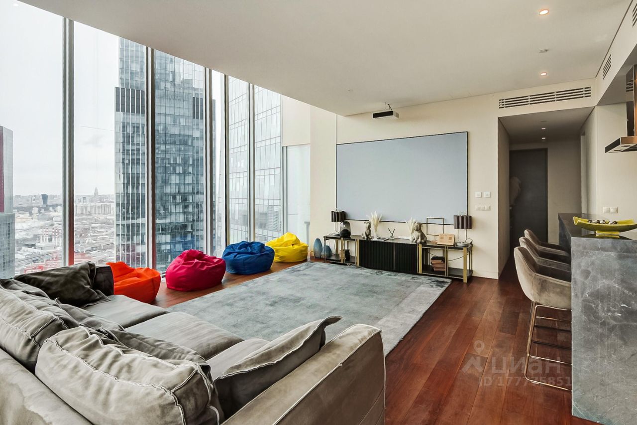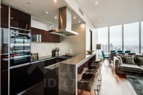 Гостиная: Просторная гостиная с открытой кухней и высокими потолками в 5 метров. Из гостиной открывается панорамный вид на Парк Победы и северо-запад Москвы. В гостиной имеется кинотеатр Philips с технологией Ambilight и беспроводной акустикой Harman Cardon. Также в гостиной есть мягкая зона с комфортным диваном, а также обеденный стол на 8 человек.