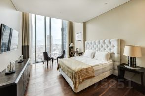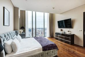 Спальни: В апартаментах две спальные комнаты, расположенные в противоположных сторонах. Мастер-спальня содержит открытую ванную комнату с видом на запад Москвы и две кровати King Size. Все окна в спальнях оснащены шторами Black Out, обеспечивающими хороший сон. Также имеются гардеробные комнаты для хранения вещей.