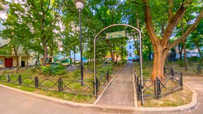 Сталинский дом с красивыми фасадами (1935 года постройки, архитектор В. К. Кильдишев; полностью реновированный в 1986 году). Огороженная охраняемая территория.