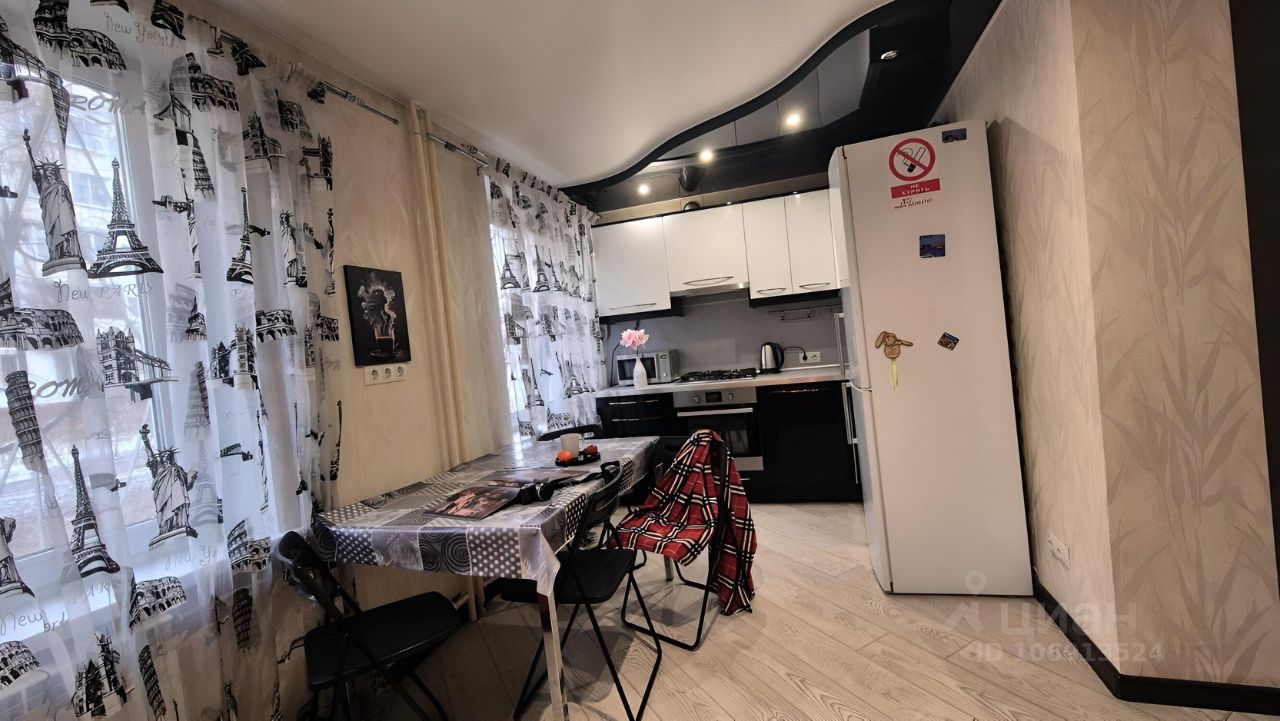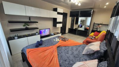 Кухня-студия, встроенный гарнитур, стоит обеденный стол на 6 персон, холодильник, стоит большой угловой диван с спальным местом 160х200 см. естьвся посуда, столовые приборы, инвентарь для приготовления еды.
