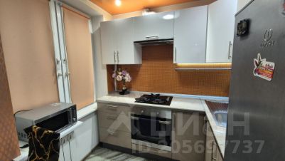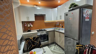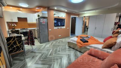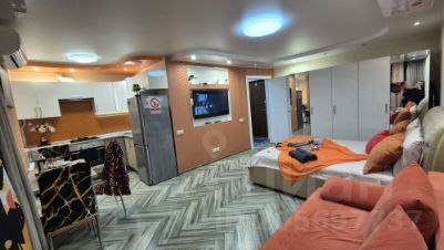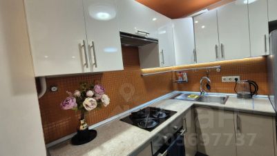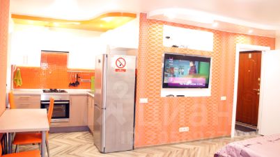 Кухня-студия, встроенный гарнитур, стоит обеденный стол на 4 персоны, холодильник, есть вся необходимая посуда, столовые приборы, инвентарь и утварь для приготовления еды.