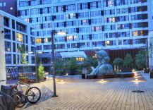 На территории велостоянка, салоны красоты, продуктовые магазины, винотека, рестораны, кафе и всё необходимое для жизни.