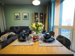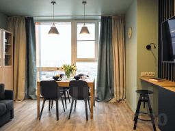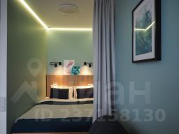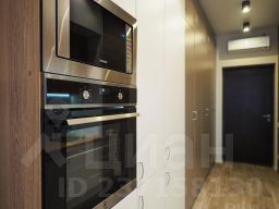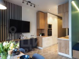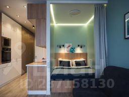 Жилое пространство студии разделено на зоны отдыха, кухни и спальни. Кухня укомплектована встроенной бытовой техникой: духовой шкаф, СВЧ-печь, измельчитель отходов и пр. В зоне отдыха: диван-кровать со спальным местом 140х200 из независимых пружинных блоков, телевизор-55" (SmartTV, телевидение МТС). Двуспальная кровать с ортопедическим матрасом 160х200. Шкафы в зоне прихожей и кухни вместят всё необходимое для комфортного проживания.