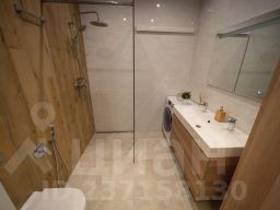 В санузле душевая кабина, раковина для двоих, гигиенический душ, стиральная машина и настенная сушилка для белья.