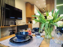 Апартаменты укомплектованы для проживания - имеется посуда, столовые приборы, постельные принадлежности и бытовая техника.