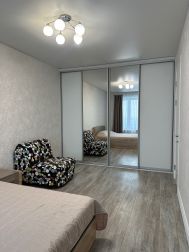- комната: кровать с ортопедическим матрасом, прикроватные тумбы, кресло-кровать, встроенный шкаф, телевизор.