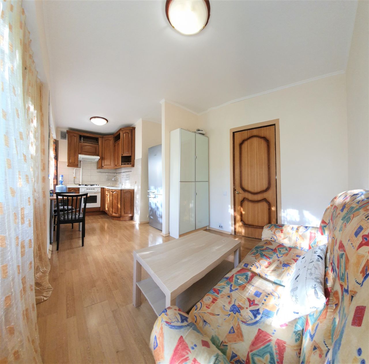 Планировка: кухня-гостиная, спальня, совмещённый санузел. В квартире есть встроенный кухонный гарнитур из натурального дерева с встроенной бытовой техникой, холодильник. В гостевая зоне расположен диван. В спальне 2-х спальная кровать, платяной шкаф, туалетный столик с зеркалом. В коридоре установлен шкаф-купе. Сан. узел совмещенный, в нем установлена стиральная машина.
