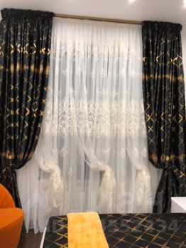 Гостиная - раскладной диван 245х345, овальный стеклянный стол + 6 стульев, огромный ТВ, Итальянские шторы системы Блэкаут.