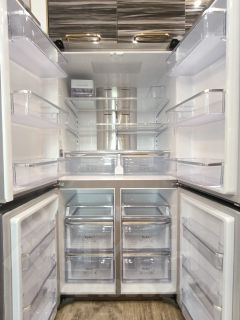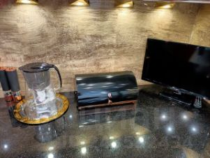Кухонная зона - очень стильная кухонная мебель сочетание высококачесвенного пластика и стекла. Гранитная столешница. Индукционная плита AEG на 4 комфорки с возможностью объединения комфорок в одну и две общие варочные поверхности, духовой шкаф Bosh, холодильник Samsyng системы Side-by-Side, посудомойка Bosh, микроволновка, кондиционер, ТВ, смеситель Grohe с несколькими режимами работы и выдвигающейся лейкой. Полностью оборудована посудой, в том числе и посуда премиум класса Gipfel, предназначенная для готовки на индукционной плите.