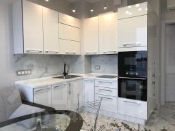 Кухня-гостиная: встроенный кухонный гарнитур с итальянскими фасадами под единой столешницей из иск.камня и стеновой панелью из закаленного стекла, вытяжка, двухкамерный холодильник, сенсорная варочная панель, посудомоечная машина, духовка, свч, дополнительный фильтр для питьевой воды с подачей через двойной кран, дополнительный подогреватель воды, раскладной диван, обеденная группа, кабельный Интернет, TV, настенная подсветка.