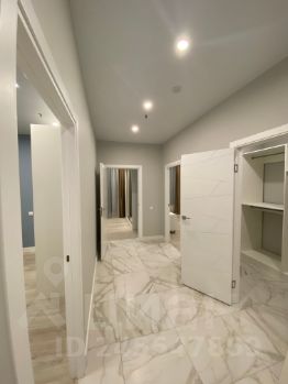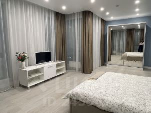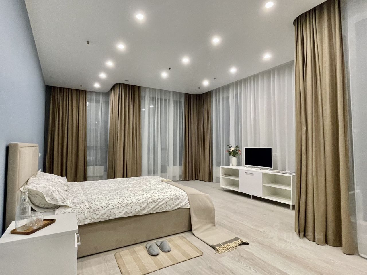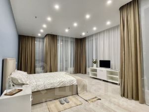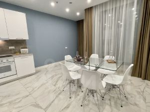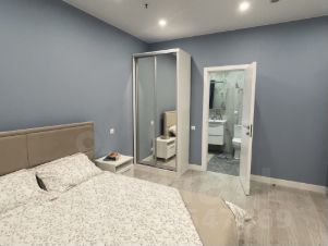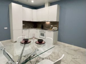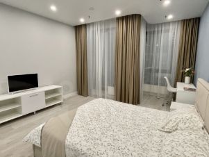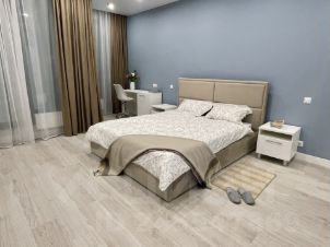 Планировка квартиры: 2 ванной комнаты, оборудованная гардеробная, большая кухня с лоджией, 2 панорамные спальные комнаты с кроватью, гостиная комната с раздвижным диваном.