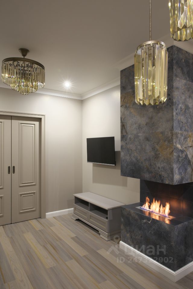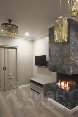 В гостиной расположен роскошный камин. Биокамин - это экологически чистый современный камин, он не дает дыма и гари. На балконе - также барная стойка по всей линии окон.
