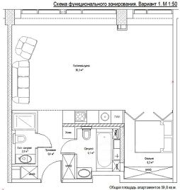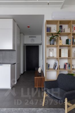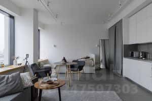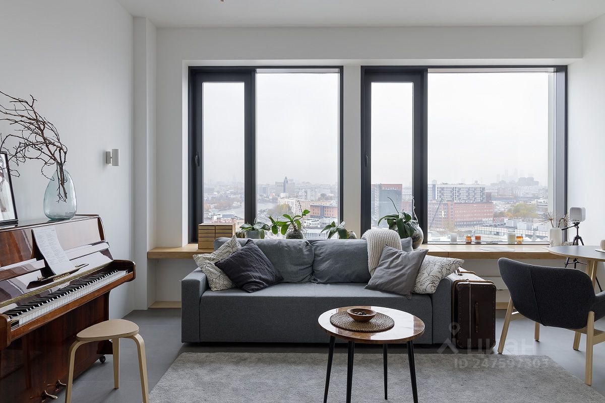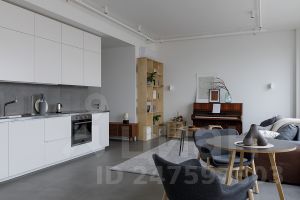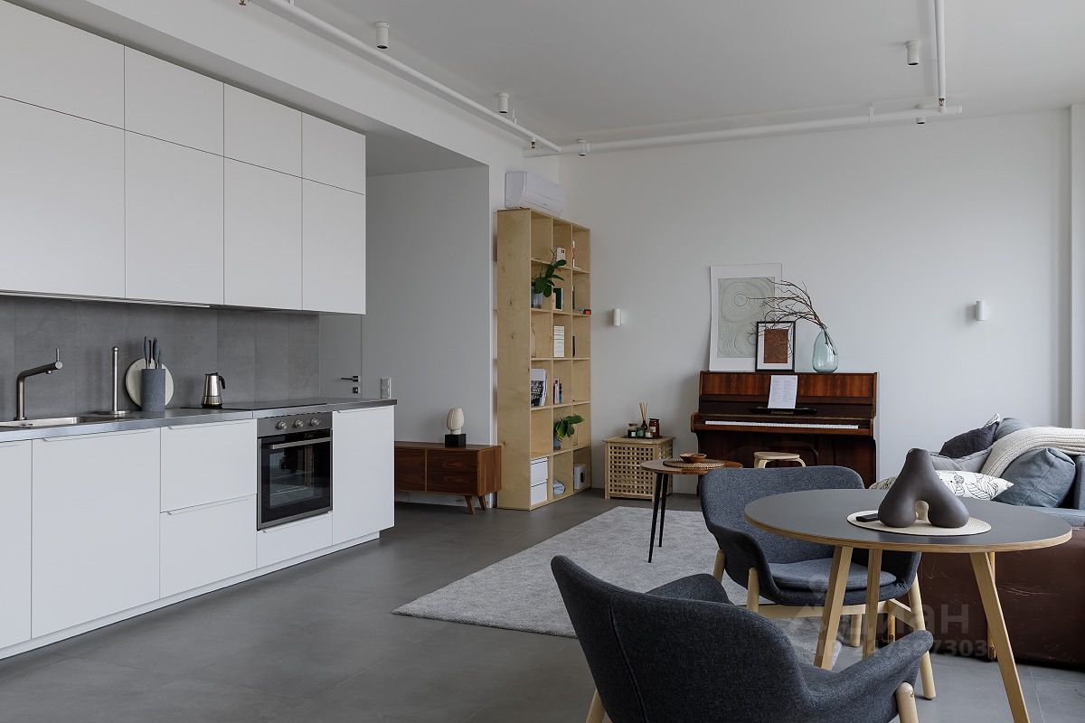 Большая гостиная-студия, объединённая с кухней. Спальня может перемещаться в пространстве. Фортепиано на фото уехало.