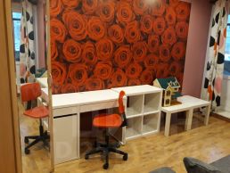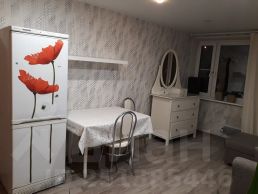 В МАЛЕНЬКОЙ КОМНАТЕ (временно не сдается) 12,6м 25,000р. (розовая с балконом): -новый диван, раскладывается и получается огромное спальное место -компьютерный стол и кресло -небольшой стеллаж -2 маленьких кофейных столика -большой угловой шкаф с полками и штангой для вешалок -балкон/лоджия Комнаты чистые, тёплые и светлые. Сделаны натяжные потолки и пол ламинат, находиться в них приятно.