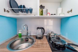 Холодильник, индукционная плита, микроволновка, электрический чайник, посуда