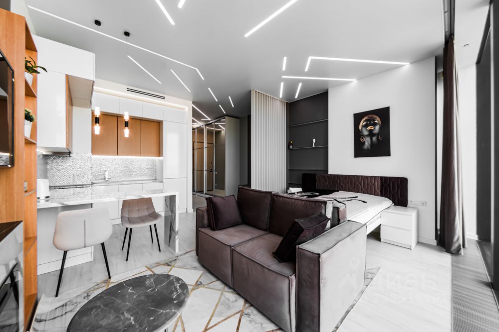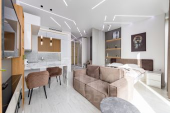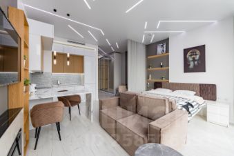 Просторная гостиная-кухня с мягкой мебелью и современной бытовой техникой.
