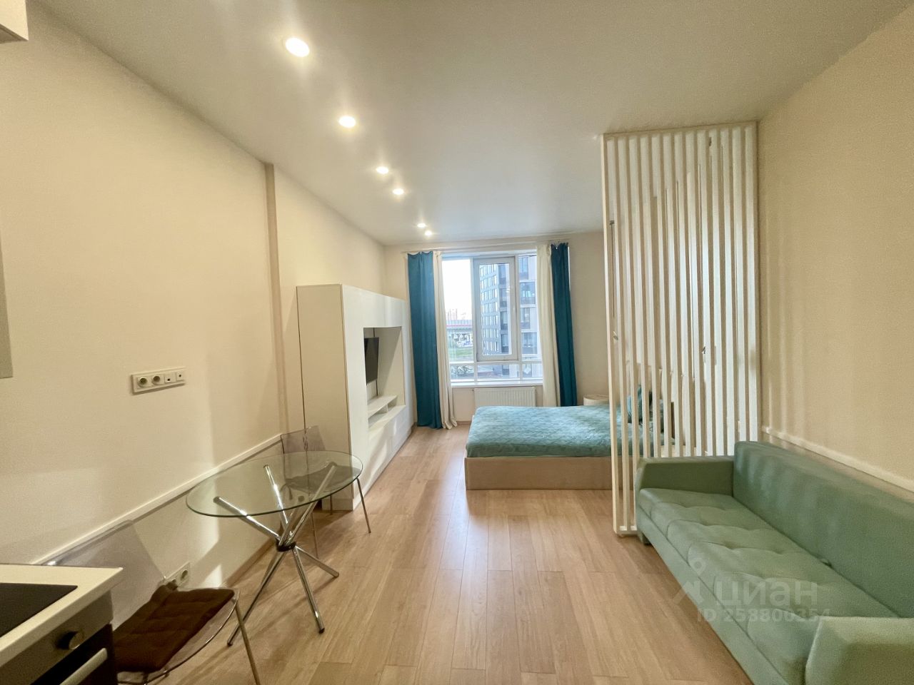 Полностью укомплектованная кухня (включая посудомоечную машину, чайник, микроволновую печь), кровать 160см с ортопедическим матрасом, раскладной диван 150см, вместительные шкафы.