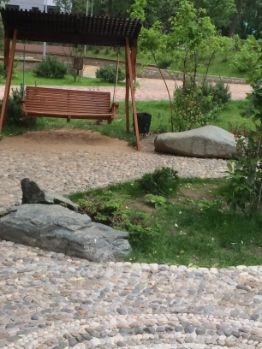 Красивый двор с ландшафтным дизайном. Через дорогу каскад прудов.