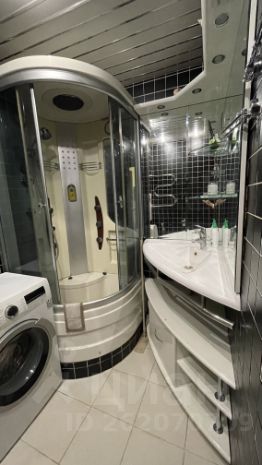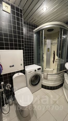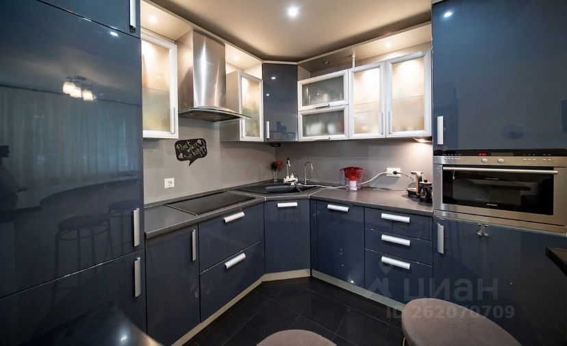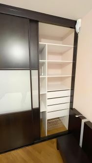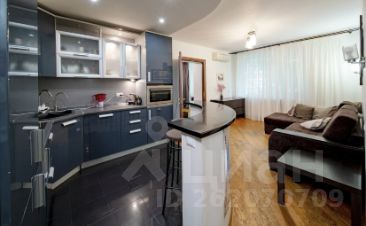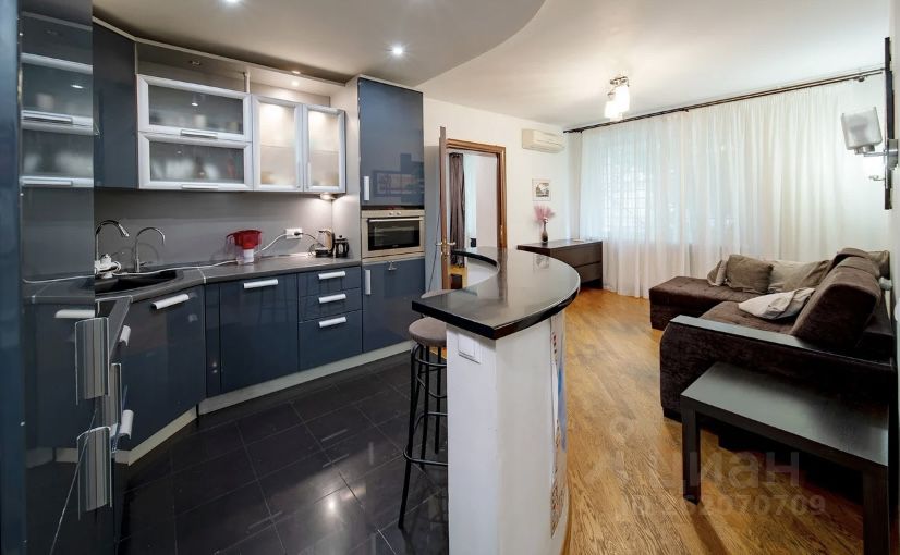 Это евротрёшка - двушка, переделанная в трешку, то есть заходим сразу в студию (кухня+гостиная), а спальня и кабинет - изолированные комнаты. В спальне большой шкаф-купе с гардеробом, большая кровать queen size (с новым матрасом), большущий комод. В студии кухонная зона, удобный раскладной диван, обеденная зона, комод, телевизор, журнальный столик. В кабинете письменный стол, стул, навесные полки. Санузел совмещенный, с душевой кабиной.