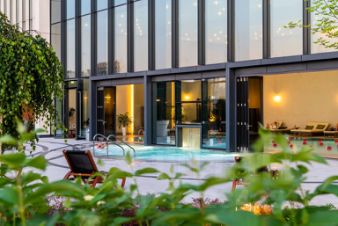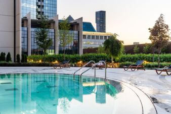 - Панорамный бассейн с джакузи под открытым небом и зоной отдыха с шезлонгами