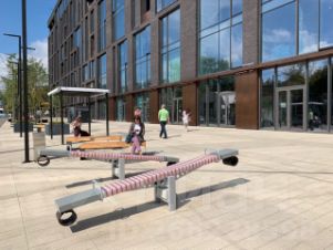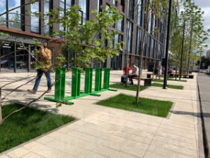 Закрытый охраняемый двор с местами для отдыха и парковкой для велосипедов.