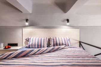 На втором уровне двухспальная кровать 160х200 с ортопедическим матрасом, большая гардеробная зона, постельное белье, подушки и одеяло, сушилка.
