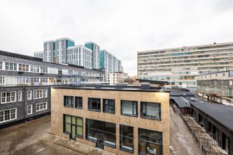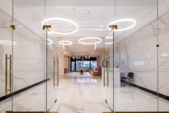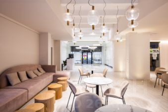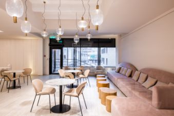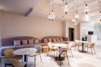 Просторная лаундж-зона с диванами, столами, стульями, где можно проводить встречи или работать.