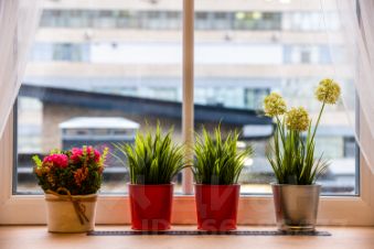 Панорамное окно с рулонными шторами.