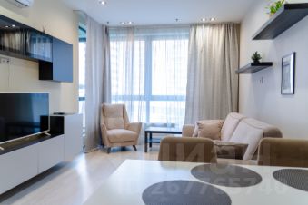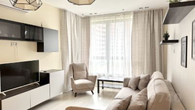 - В гостиной большой мягкий диван на против которого большой smart ТV, уютное кресло и журнальный столик.