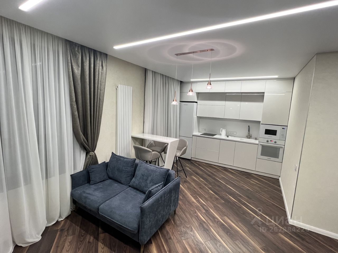 Большая кухня-гостиная (27 метров) оснащена новой мебелью и техникой, столешница выполнена из искусственного камня.