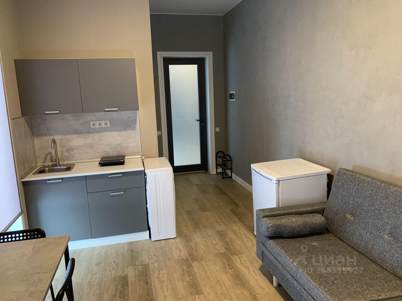 Студия находится в частном доме. Свой санузел. Есть все необходимое для проживания: стиральная машина, холодильник, плита, стол.