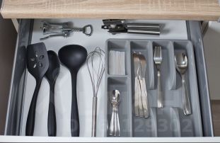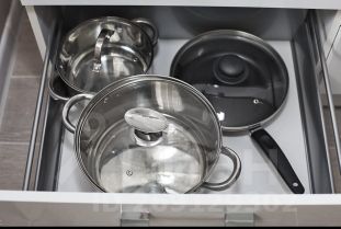 Полностью оборудованная кухня с необходимыми кухонными принадлежностями и посудой
