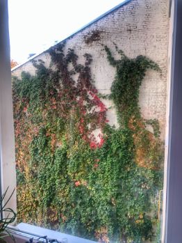 Высота потолков 3,8 метра, окна выходят во двор, одна из стен покрыта плющом который меняет свой облик все сезоны.