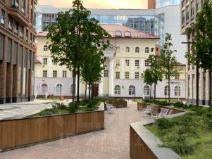 Двор без машин, безопасность и комфорт для всех гостей. На территории магазины, кафе, прогулочная зона с качелями и скамейками рядом с фонтаном.